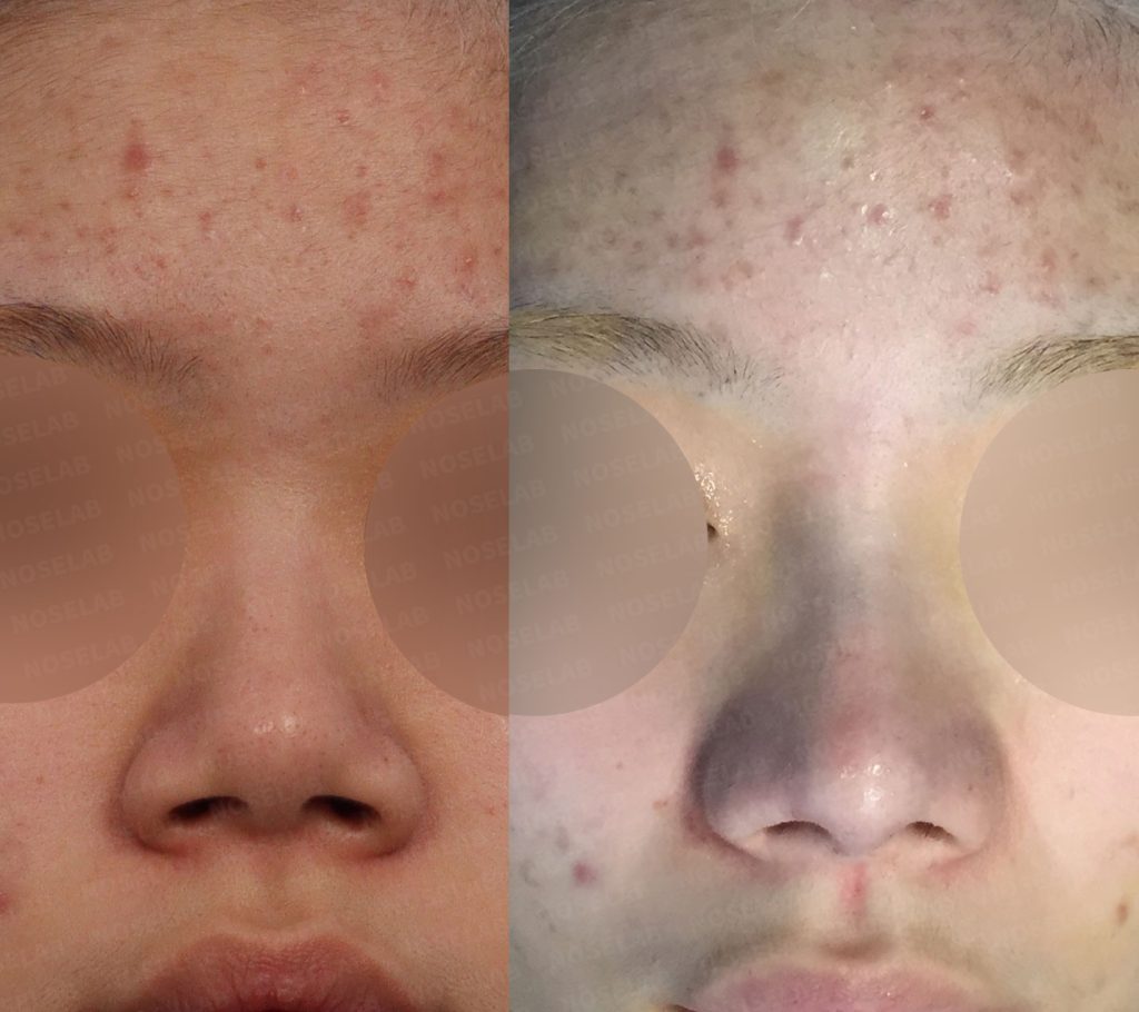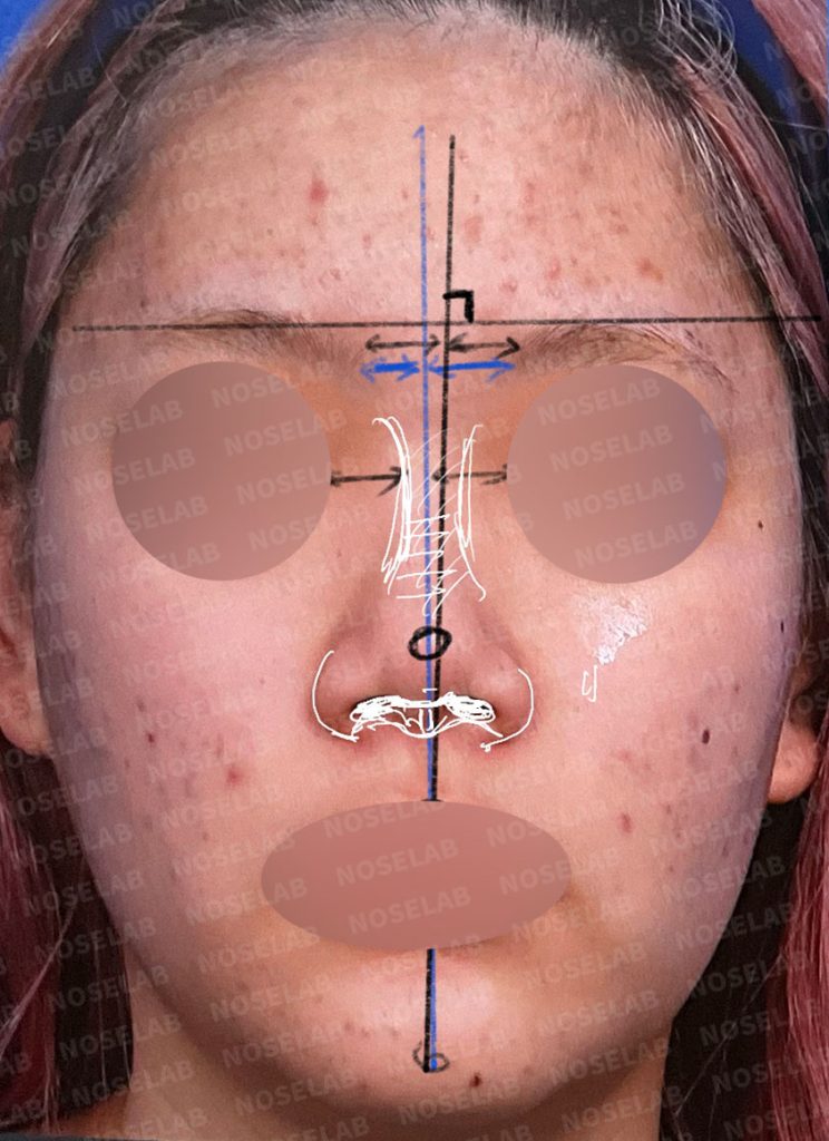 The patient above came to my clinic to correct the feeling of bulbous and spread. This is a picture of the face analysis during preoperative consultation. Due to severe facial asymmetry, the nose looked bent, and the nose was wide and the columella was greatly retracted, so the nose was more spread out from the front. In addition, there was a protruding mouth and a lot of nostrils were seen in the front.