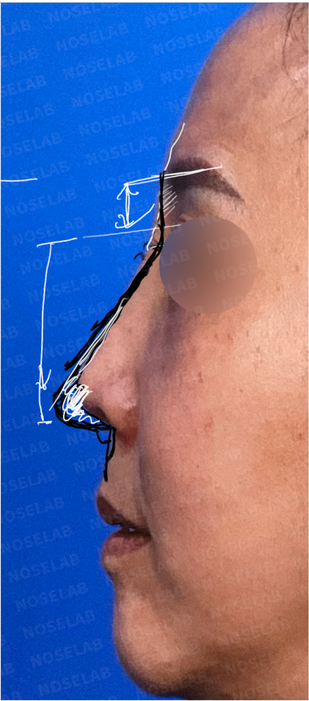 Today we have a case of a corrective surgery on a patient whose glabella had become too high after having surgery, which made her eyes look too fierce and close together. The nose was long and overall bent to the right side. Before the surgery, she said that the nose starting point and the nose bridge were too hight, which made it look unnatural.