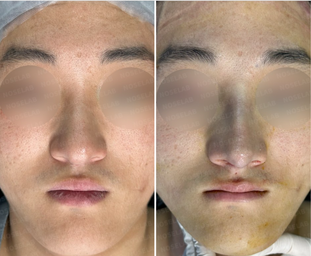 The nose tip that was bending to the right side was definitely corrected and the right part of the nasal alar that appeared to be smaller was also improved.