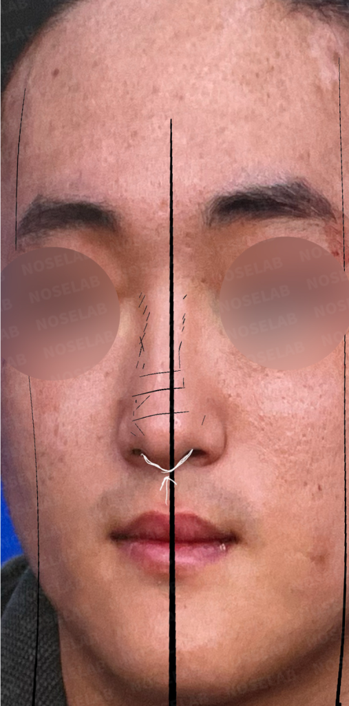 - The parts that look diagonally bent form the front ➜ Nasal bone osteotomy to move the nasal bone and the parts of the septal cartilage to the left.